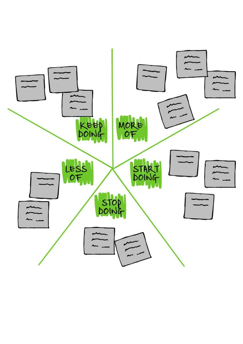 - まずは「Keep(続けるもの)」を挙げ、そこから「Less of(減らすもの)」「Stop(やめるもの)」を、「More of(増やすもの)」「Start(はじめるもの)」をそれぞれ挙げる